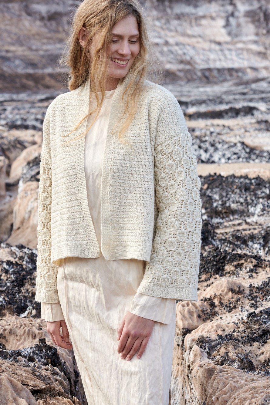 Upea, virkattu villatakki.