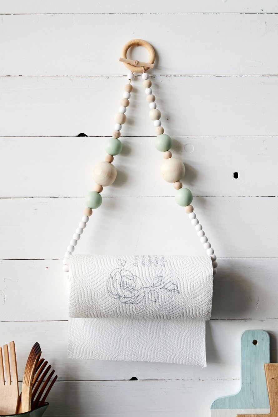 Juuttunarusta, puuhelmistä ja verhonrenkaista tehty talouspaperiteline.