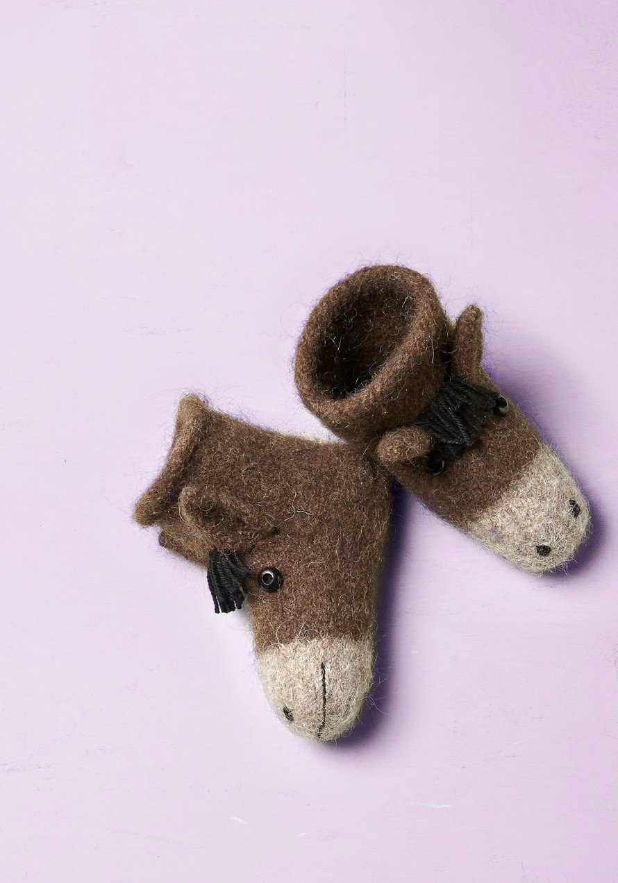 Paksusta hupuvasta villalangasta neulotut tossut.