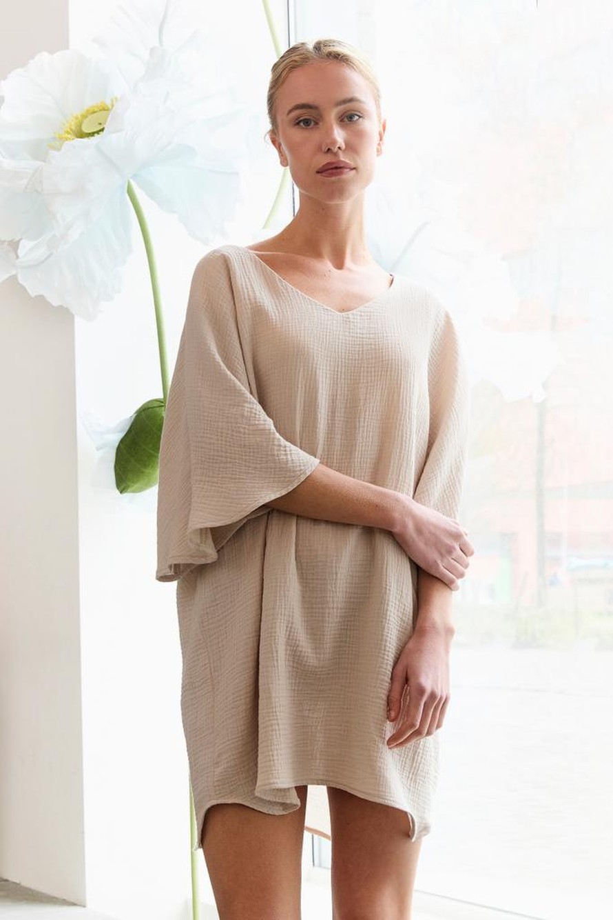 Pehmeästä double gauze -kankaasta ommeltu tunika.