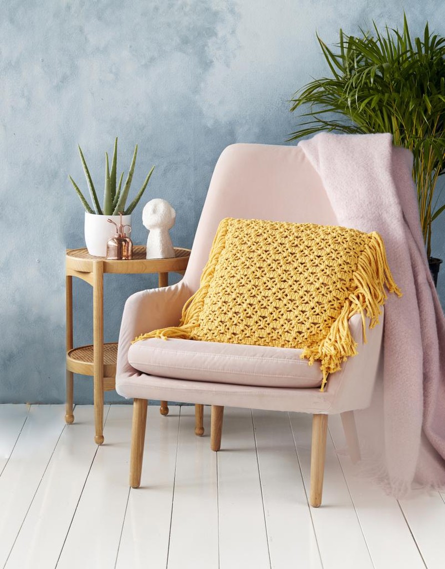 Makrameetekniikalla solmittu tyyny.