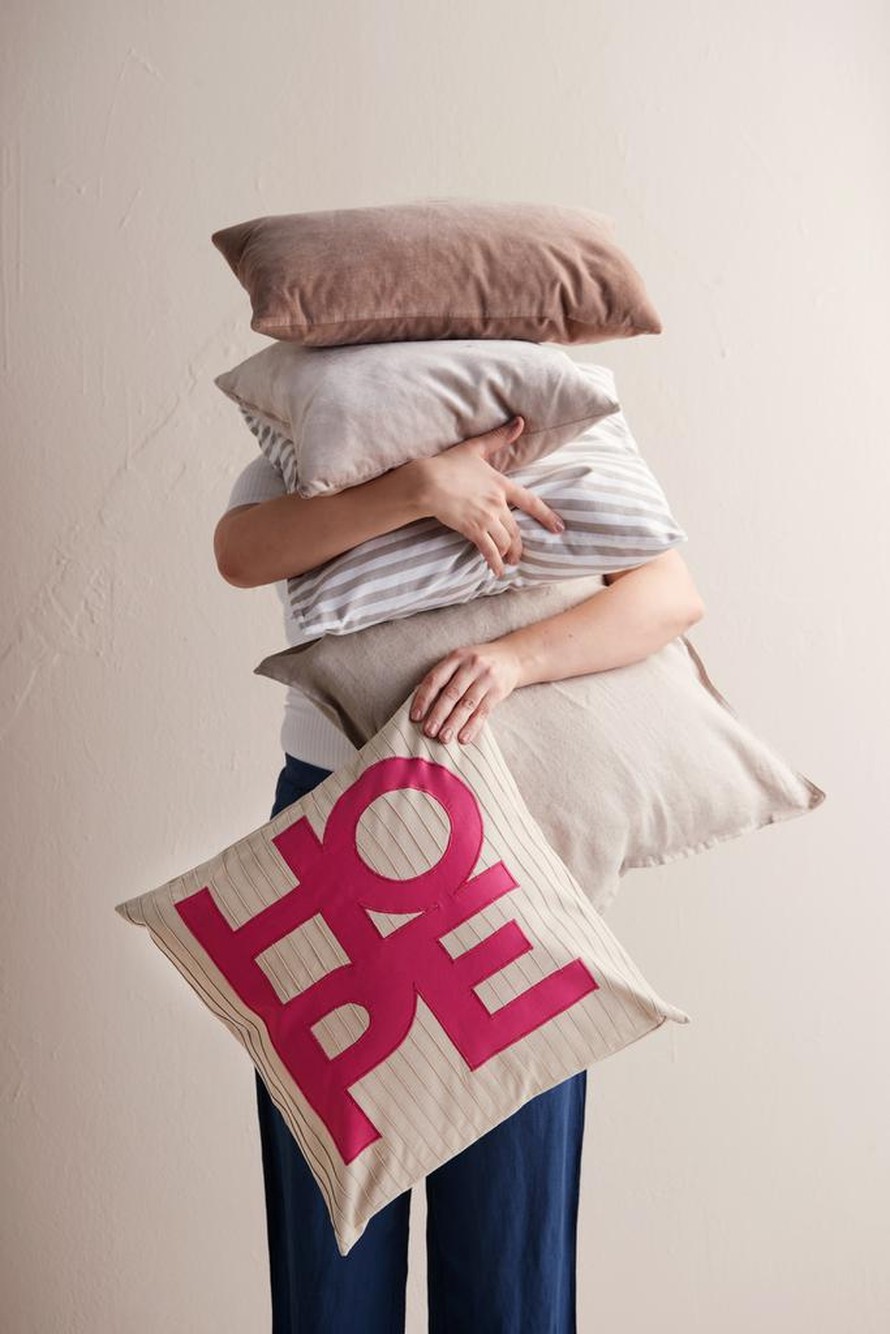 kierrätyskankaista ommeltu Hope-tyyny, koko 50 x 50 cm.