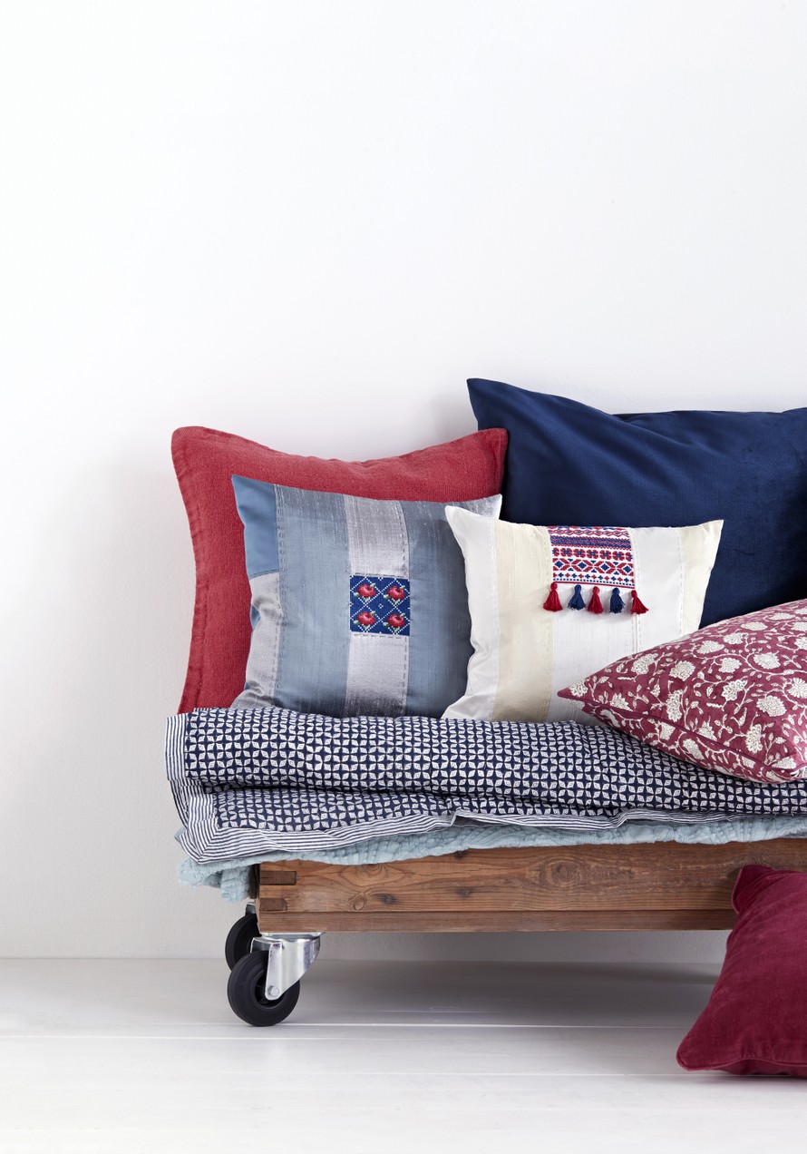 Kirjottu ruusukuvioinen ja perinteinen neulekuvio tilkkutyynyssä.