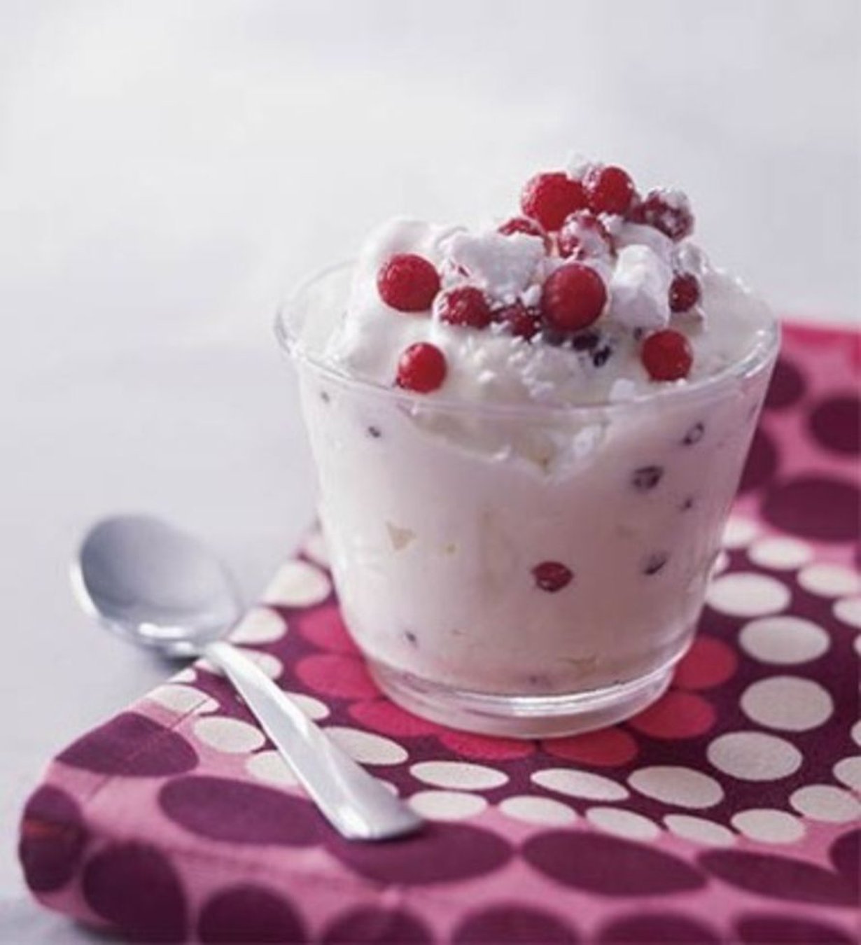 - Vaahdota vaniljakastike. Pane sekaan murennettu marenki ja jäiset puolukat. Voit jättää muutaman marjan koristeluun.