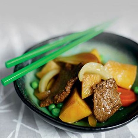 - Nosta sipulit ja porkkanat pataan ja lisää sekaan lihapalat, sitruunamehu, soija ja vettä niin paljon, että liha peittyy. Mausta pippurilla. Peitä pata kannella ja paista uunin alatasolla 200 asteessa puoli tuntia. Alenna lämpö 175 asteeseen ja paista edelleen 40 minuuttia.