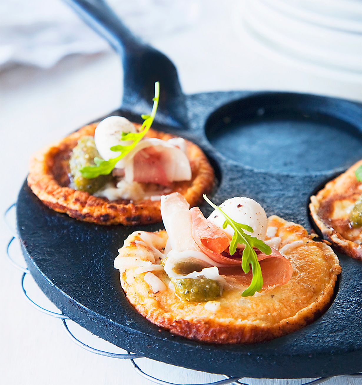 - Ripottele juustoraaste tällöin ennen paistamista pannarin päälle. Tarjoile ilmakuivatun kinkun, mozzarellan, peston ja rucolan kanssa.