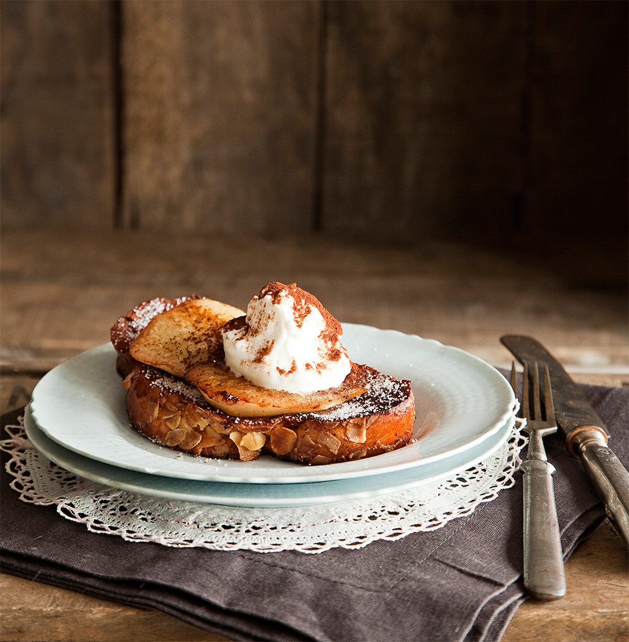 Köyhien ritareiden rikkaampi versio syntyy, kun kastelet pullaviipaleet maidon, kaakaojauheen ja sokereiden seoksessa ja päälle nostetaan paistettuja päärynöitä.