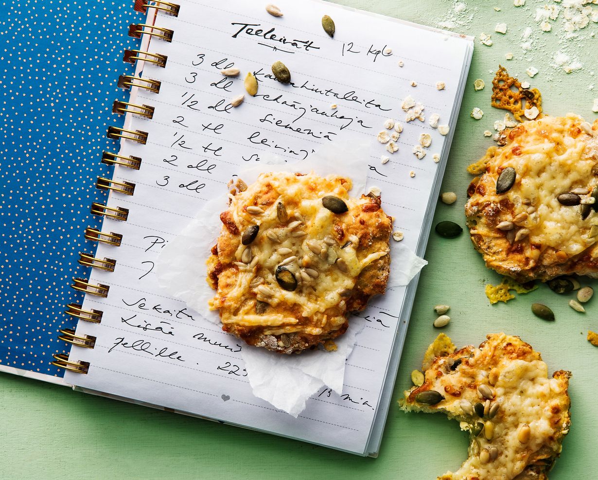 - Jaa taikina 12 nokareeksi leivinpaperin päälle. Taputtele palat noin sentin paksuisiksi leipäsiksi. Ripottele päälle juustoraaste ja siemenet.