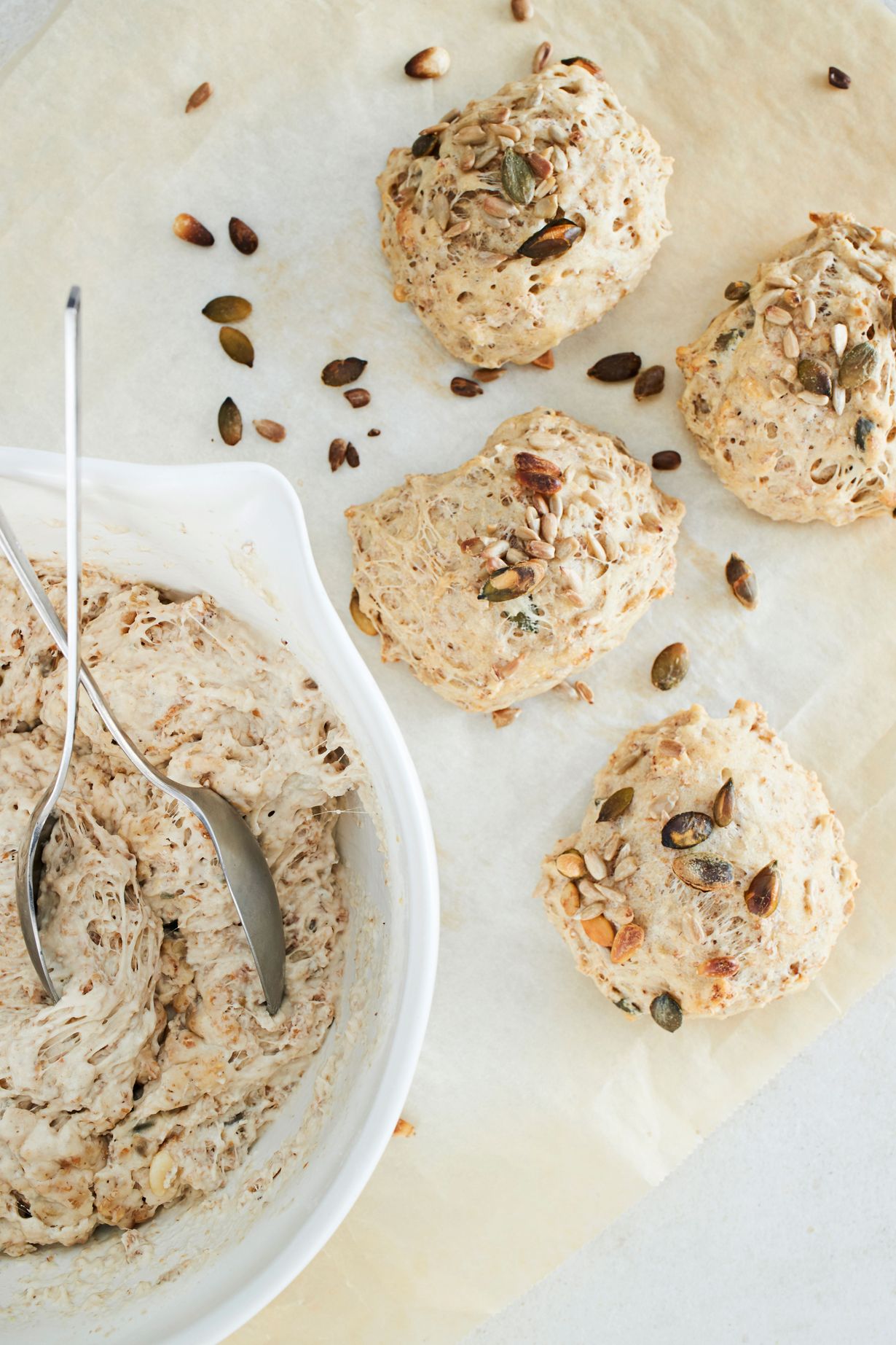- Kauhaise taikina kahdella isolla lusikalla nokareiksi leivinpaperin päälle pellille. Ripottele päälle halutessasi siemeniä tai jauhoja.
