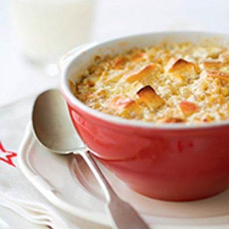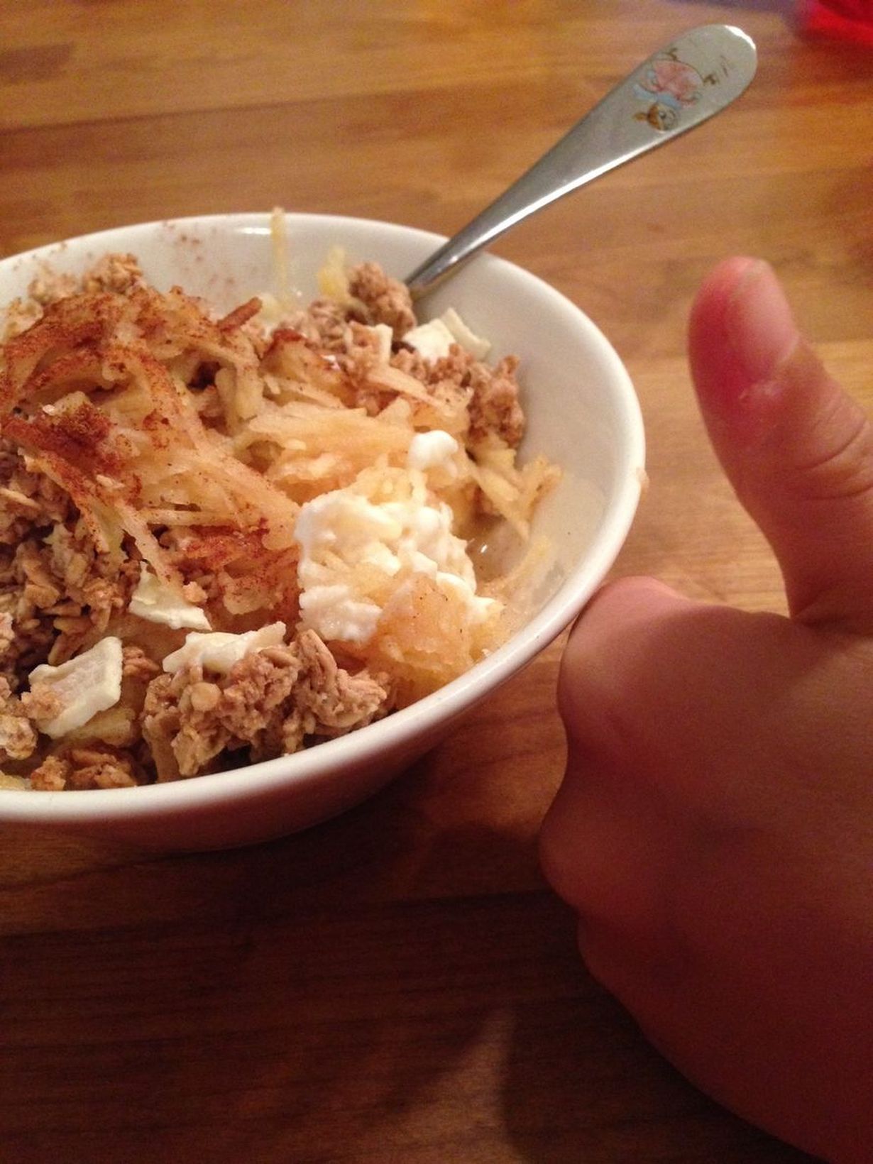 - Raasta omena kulhon pohjalle. Ripottele päälle kanelia. Sekoita.