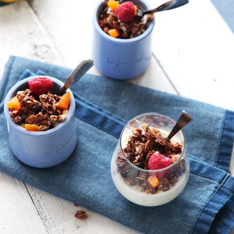 - Kaada päälle ensin jugurtti, sitten mysli, pähkinät ja kuivatut marjat. Valuta kruunuksi hunajaa.