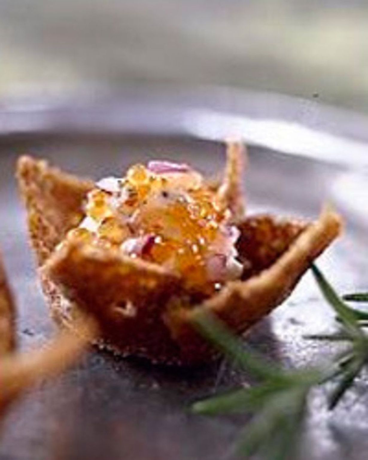 - Tee jähmettyneestä juustosta pariisinperunaraudalla pieniä palloja. Laita pallot hapankorppukruunuihin. Koristele pinta mädillä ja punasipulihakkeella. Rouhi pinnalle mustapippuria.