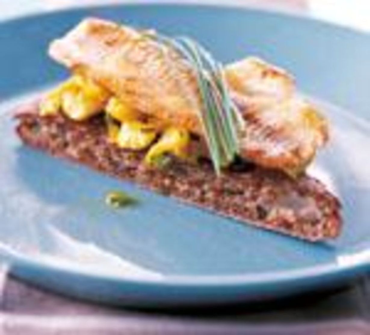 - Paista leipiä pienellä lämmöllä paistinpannulla, kunnes ne ovat lämpimiä ja juusto hieman sulanut. Voit paistaa leipiä myös uunin keskitasolla 200 asteessa 5-10 minuuttia. Leikkaa leivät halutessasi kolmioiksi. Aseta leivät lautaselle. Laita kukkakaalipaistosta päälle ja päällimmäiseksi kuumat ahvenfileet. Tarjoa viileän valkoviinin kanssa.