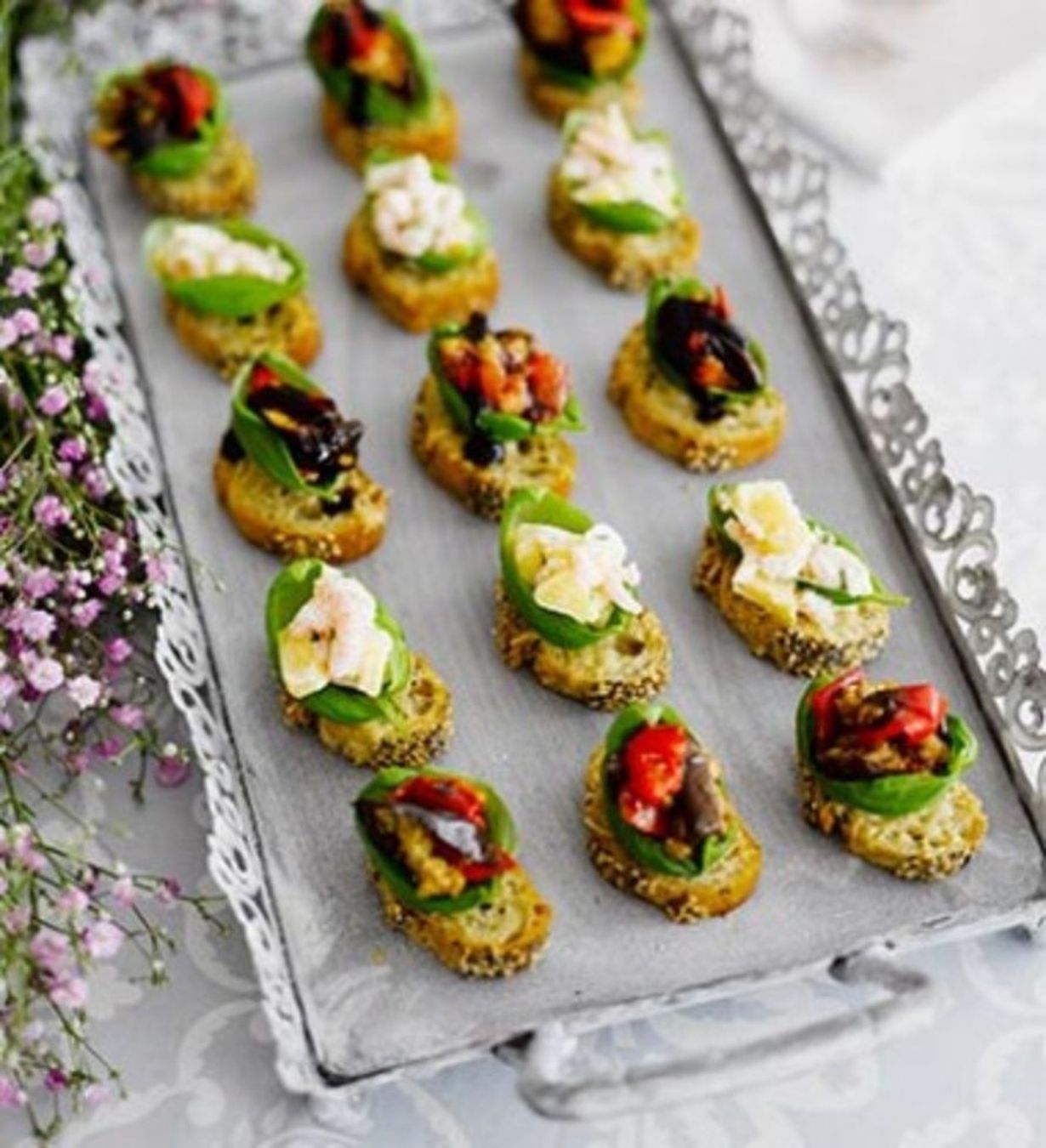 Kuori mango ja leikkaa pieniksi paloiksi. Yhdistä kaikki aineet. Laita jokaiselle paahdetulle leipäviipaleelle basilikan lehti nurinpäin. Nosta teelusikalla täytettä ”kuppiin.”