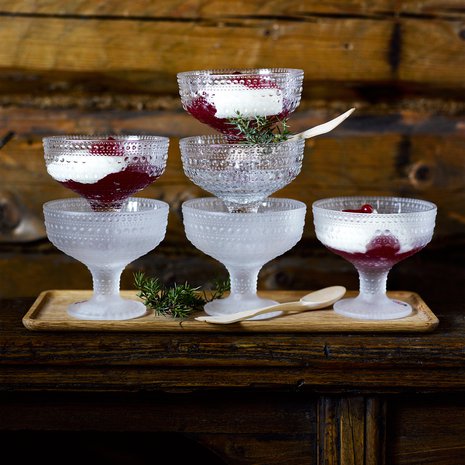 - Annostele tarjoilulaseihin puoleen väliin asti kylmää aprikoosikiisseliä. Lusikoi jugurtti kiisselin päälle ja asettele koristeet paikoilleen.