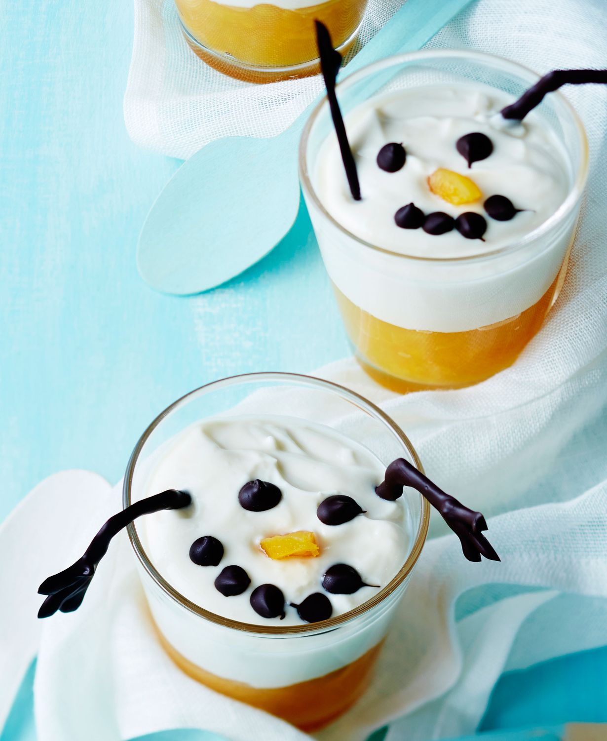 - Sulata tumma suklaa ja siirrä se pakastuspussiin. Leikkaa pussin kulmaan pieni reikä. Pursota leivinpaperille lumiukon oksakäsiä ja pisaroita silmiksi ja suuksi. Nosta kuviot jääkaappiin. Leikkaa aprikoosista pienet nenät.