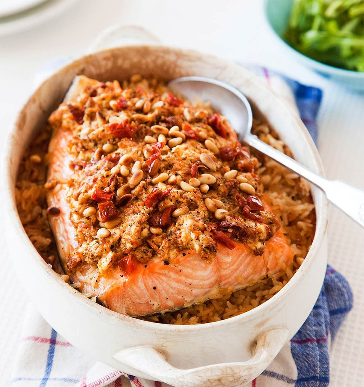 - Yhdistä pesto tuorejuustoon. Levitä seos esipaistetulle kalalle. Jatka paistamista vielä noin 10 minuuttia tai kunnes lohi ja riisi ovat kypsiä. Tarjoa keitettyjen vihannesten tai vihreän salaatin kera.