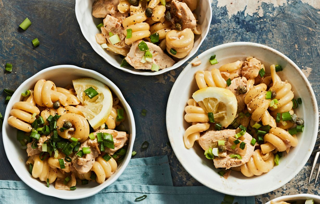 - Yhdistä pasta ja kastike. Anna vetäytyä hetki kannen alla. Viimeistele annokset kevätsipulilla, kapriksilla ja sitruunalla.