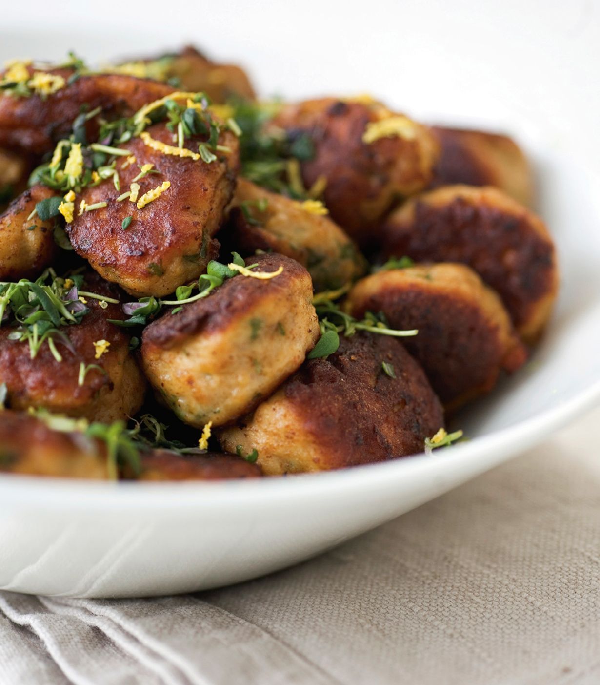 Raastettu sitruunan kuori antaa raikkaan säväyksen kanapullille.