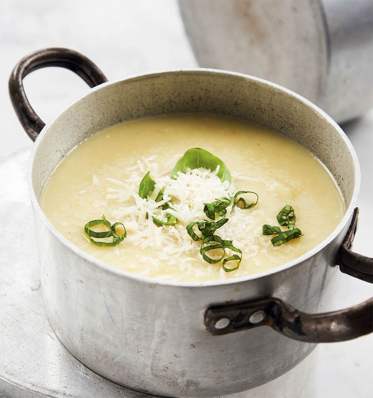 - Lisää parmesaaniraastetta maun mukaan (maukkaimman lopputuloksen saat, jos raastat juuston itse). Jos keitto on liian paksua, ohenna sitä vedellä, maidolla tai kermatilkalla.