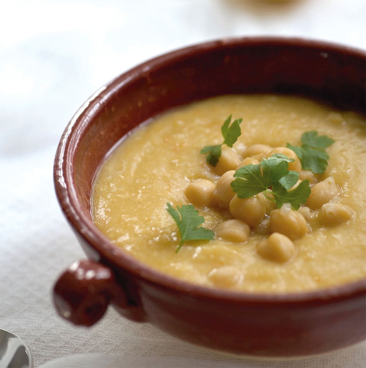 - Valmista keitto. Kuullota kattilassa oliiviöljyssä hienonnettu sipuli. Lisää vesi sekä kuoritut ja paloitellut porkkanat ja esikeitetyt kikherneet.