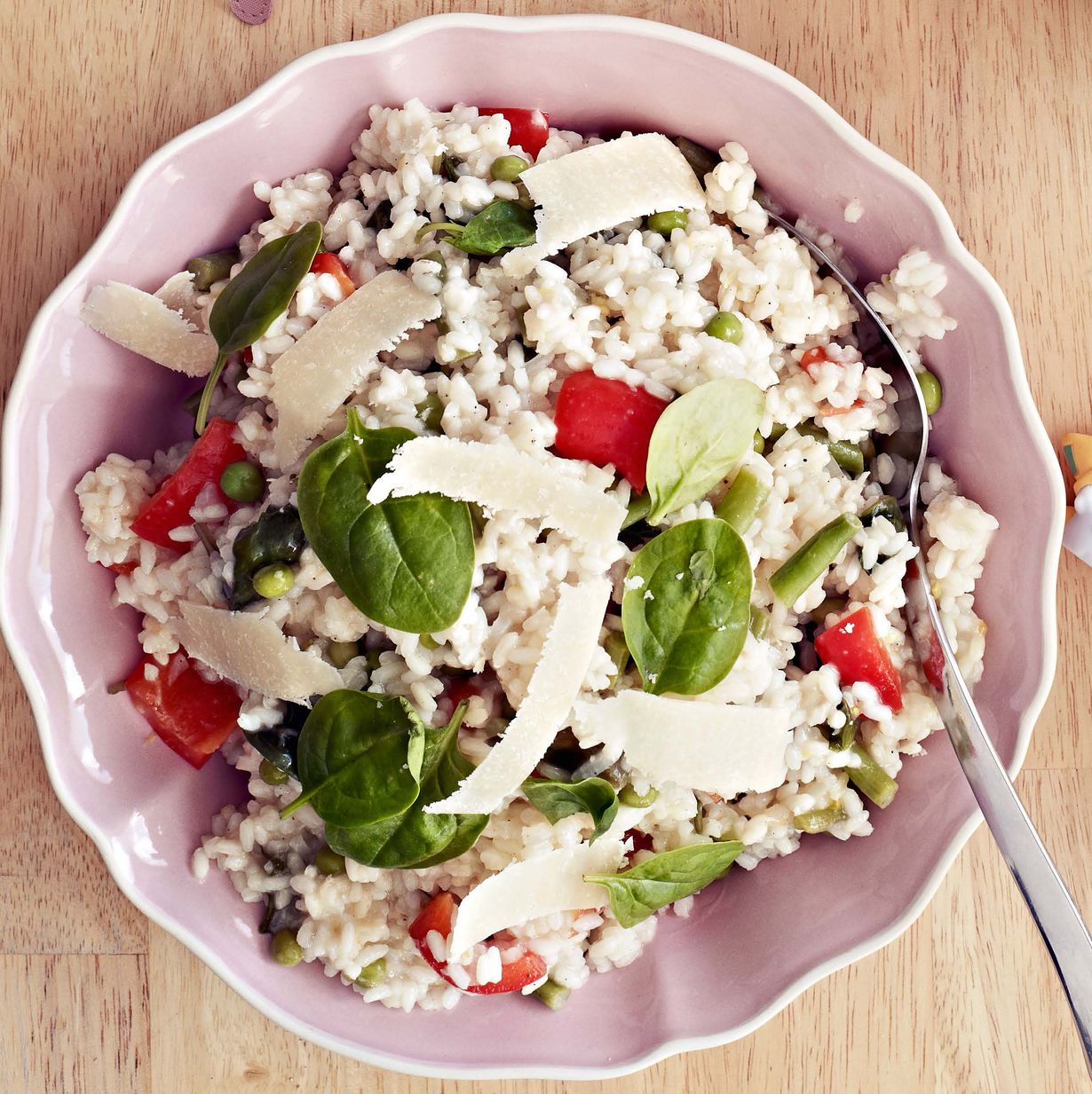 - Lisää pavut ja herneet kun riisi on juuri ja juuri kypsää. Mausta suolalla ja pippurilla. Lisää lopuksi tuoretta pinaattia, sekoita hyvin.