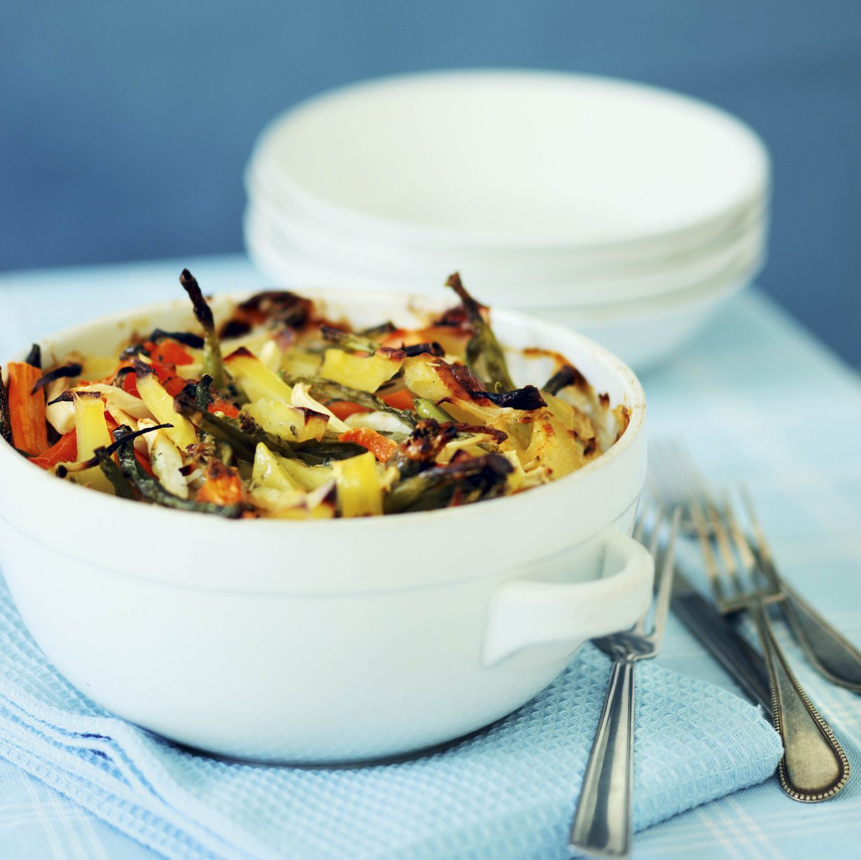 - Kypsennä kiusaus 200 asteessa uunin alatasolla noin 45 minuuttia, kunnes kasvikset ovat pehmeitä. Tarjoile sellaisenaan kasvisruokana, paistetun makkaran tai jauhelihapihvien kanssa.