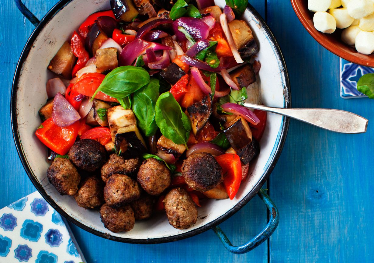 Lusikoi lautaselle hehkeää kasvispaistosta ja höystä muutamalla lihapullalla ja mozzarellapallolla.