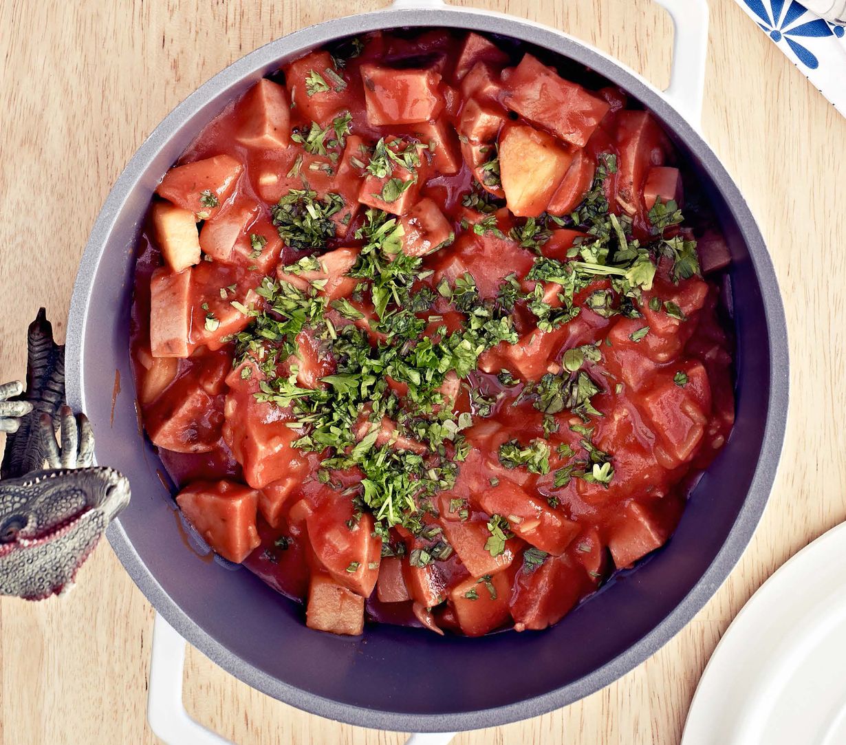 - Kuullota sipuleita ja omenoita öljytyssä kattilassa muutaman minuutin ajan. Kaada paseerattu tomaatti, vesi ja oregano sipuleiden joukkoon. Anna kiehua 10 minuuttia niin, että omenat kypsyvät. Lisää makkarat. Mausta sinapilla, suolalla, mustapippurilla ja cayennenpippurilla. Tarkista maku.