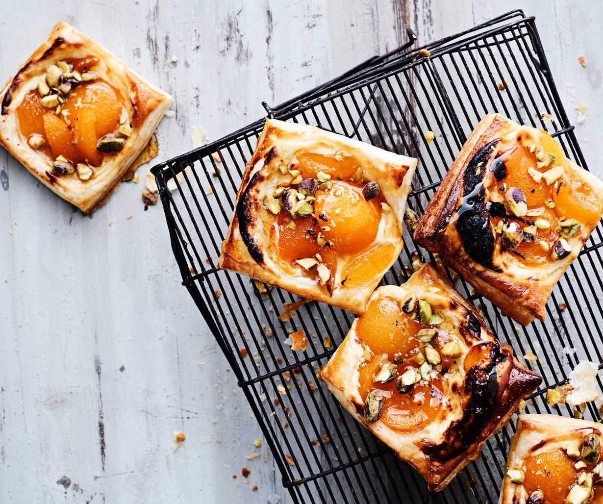 - Valuta aprikoosit ja laita talouspaperin päälle kuivahtamaan. Viipaloi osa aprikooseista. Levitä viipaleita ja puolikkaita tuorejuuston päälle. Voitele taikinan reunat munalla.