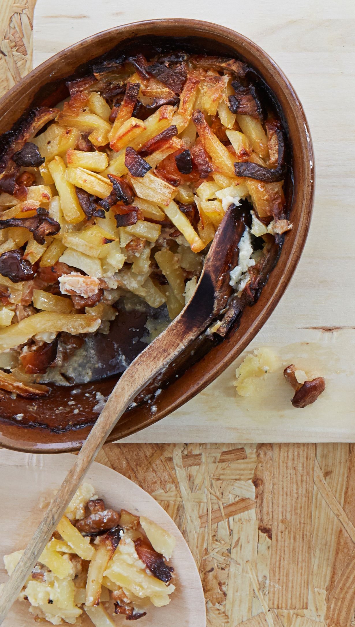 - Laita vuoka uuniin noin 30-40 minuutiksi, kunnes kiusaus on saanut väriä ja neste on imeytynyt perunoihin.