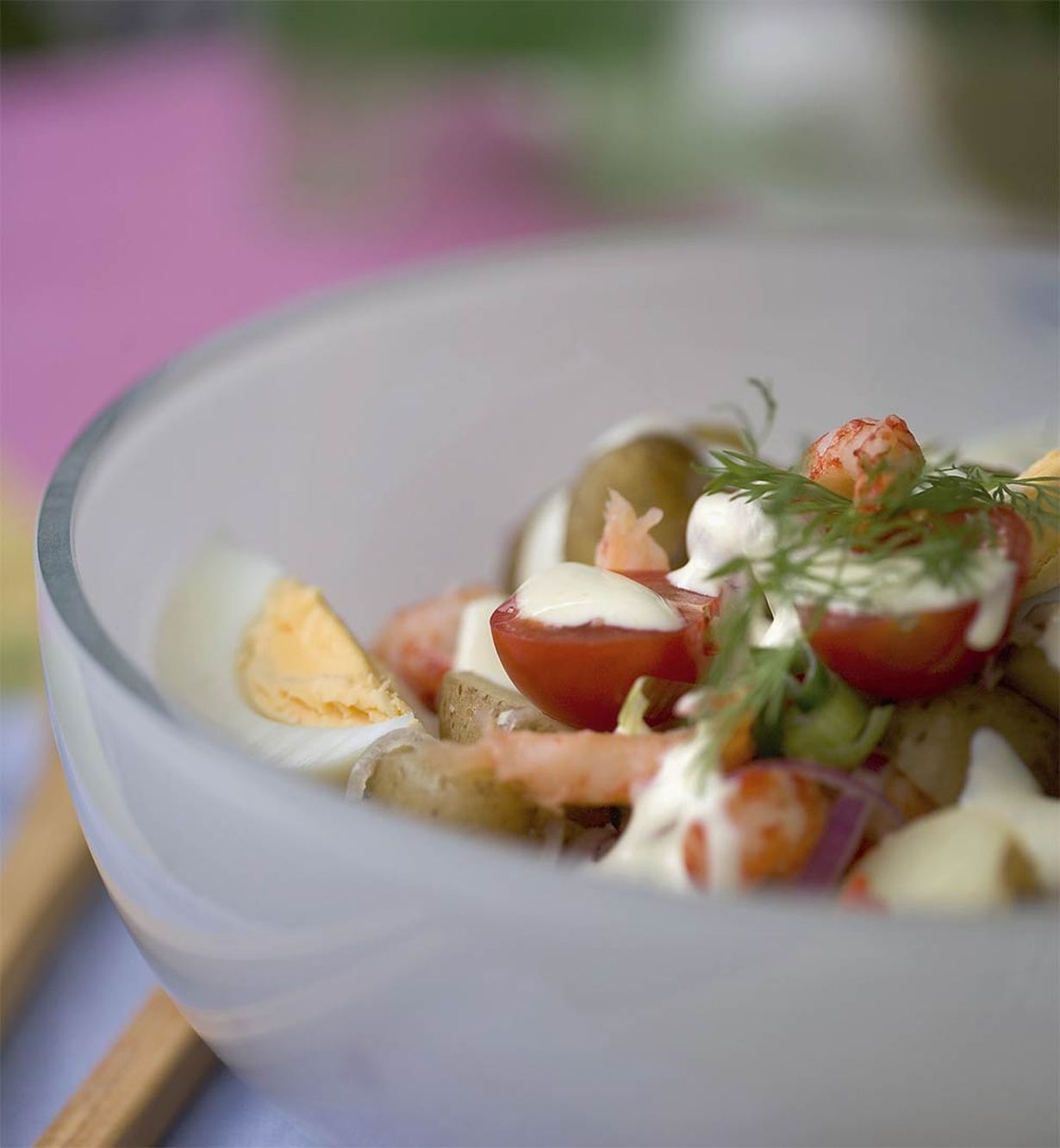 - Pese ja harjaa perunat. Keitä kypsiksi. Jäähdytä ja halkaise kahteen tai neljään osaan. Kuori sipulit ja leikkaa ohuiksi renkaiksi. Puolita renkaat. Leikkaa kurkku suupaloiksi. Kuori munat ja leikkaa lohkoiksi. Sekoita kaikki salaattiaineet isossa kulhossa.