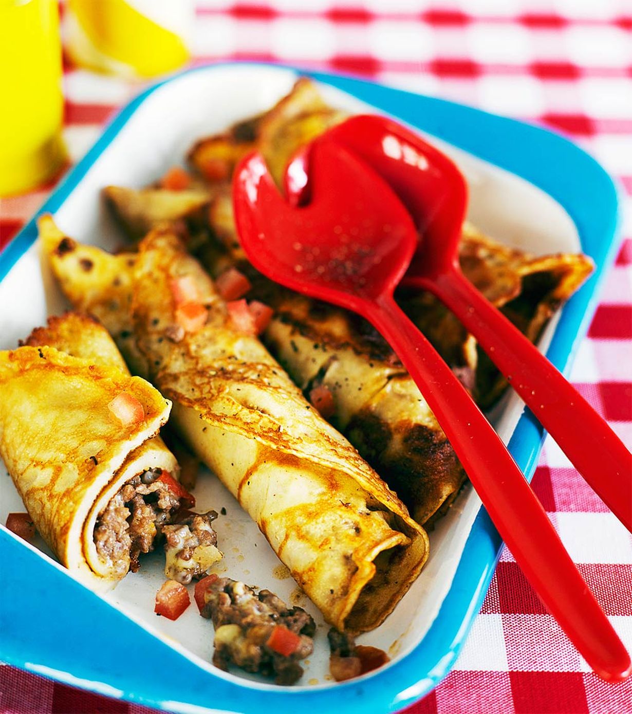 Vanha kunnon Koskenlaskija maustaa jauhelihakastikkeen. Isot ohukaiset voit paistaa hyvissä ajoin etukäteen.