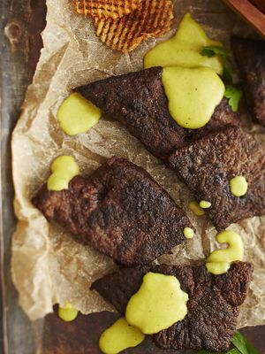 Maksapihvit, vohveliperunat ja curry-banaanikastike