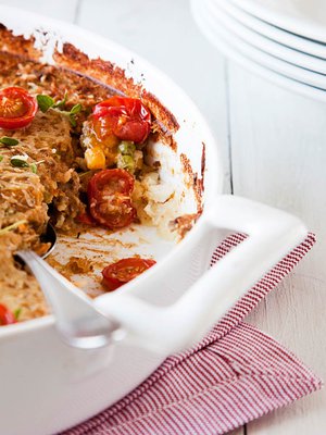 Reseptit Reseptit Täyteläinen ja mausteinen kasvispata lämmittää – munakoiso, kesäkurpitsa ja tomaatit lähes sulavat suuhun