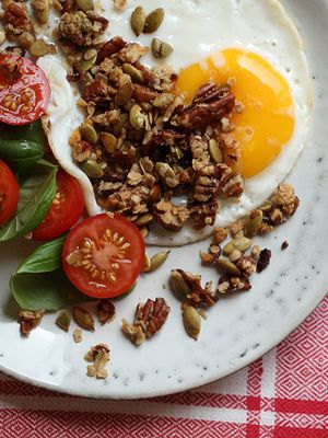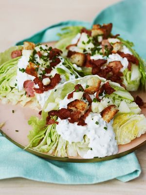 Lämmin ruusukaali-pekonisalaatti ja gluteeniton siemenleipä