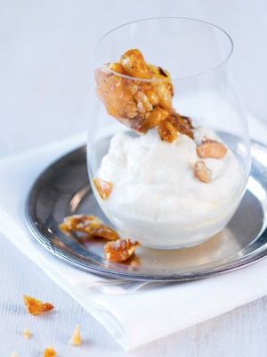 Sitruuna-valkosuklaamousse ja rapeaa praliinia
