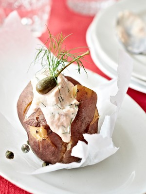 Lohitäytteiset uuniperunat ovat ihana klassikko