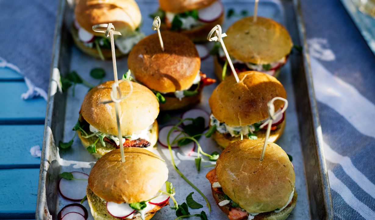 - Kokoa burgerit laittamalla leivän väliin lohisiivu, omena-kurkkumajoneesia, viipaloituja retiisejä ja krassin versoja.