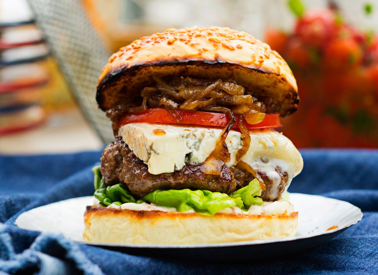 Juustolla ja oliiviöljyllä mehevöitynyt sämpylä saa sisäänsä grillissä paistetun jauhelihapihvin, karamellisoituneita sipuleita ja pekonimajoneesia. Pala sinihomejuustoa kruunaa annoksen!