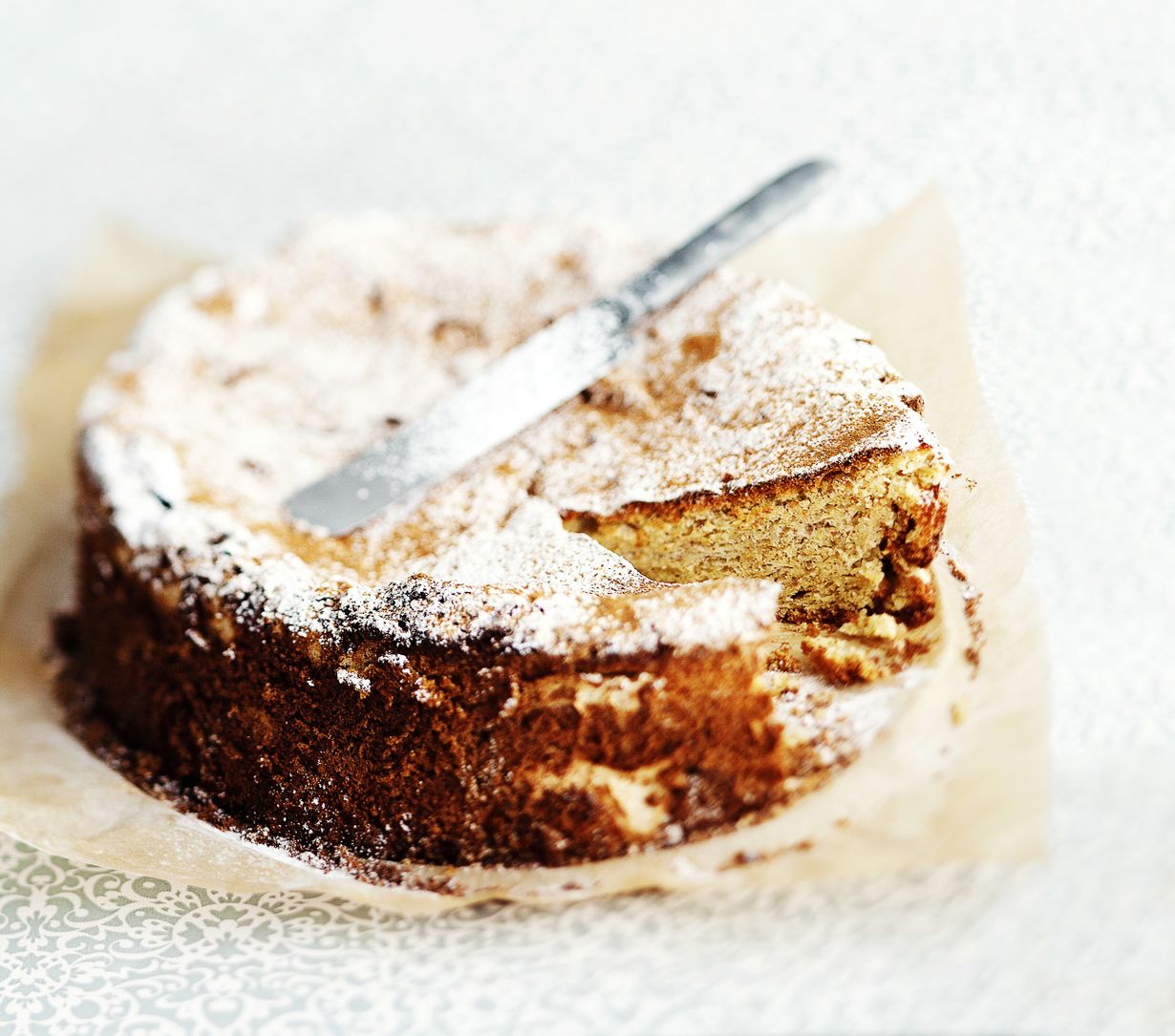 Houkuttelevan höttöinen leivonnainen makeutetaan hunajalla, eikä rasvaa tai vehnäjauhoja käytetä. Pähkinät, sitruunankuori ja kaneli antavat maun.