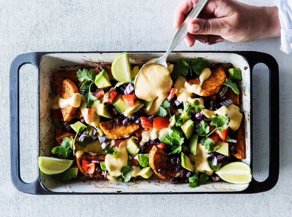 - Halkaise avokado, poista kivi, kuori ja leikkaa paloiksi. Kuutioi tomaatti, hienonna sipuli ja korianteri. Leikkaa limetti lohkoiksi. Levitä lisukkeet bataattivuokaan, lusikoi päälle kastiketta, koristele limetin lohkoilla ja tarjoile lämpimänä.