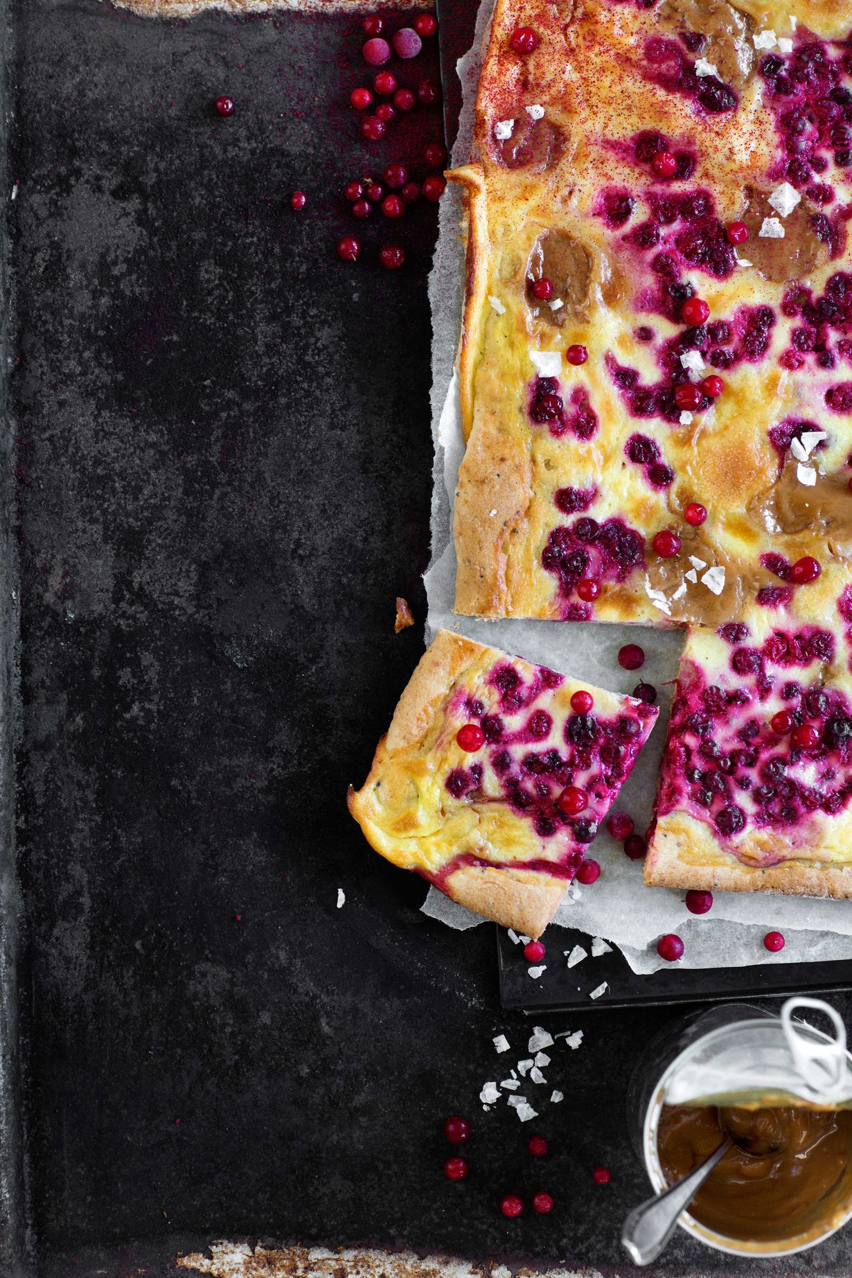 Iki-ihana pullapohjainen puolukkapiirakka on nyt gluteeniton. Kermaisessa täytteessä lumoavat suolakiteillä viimeistellyt toffeesattumat.