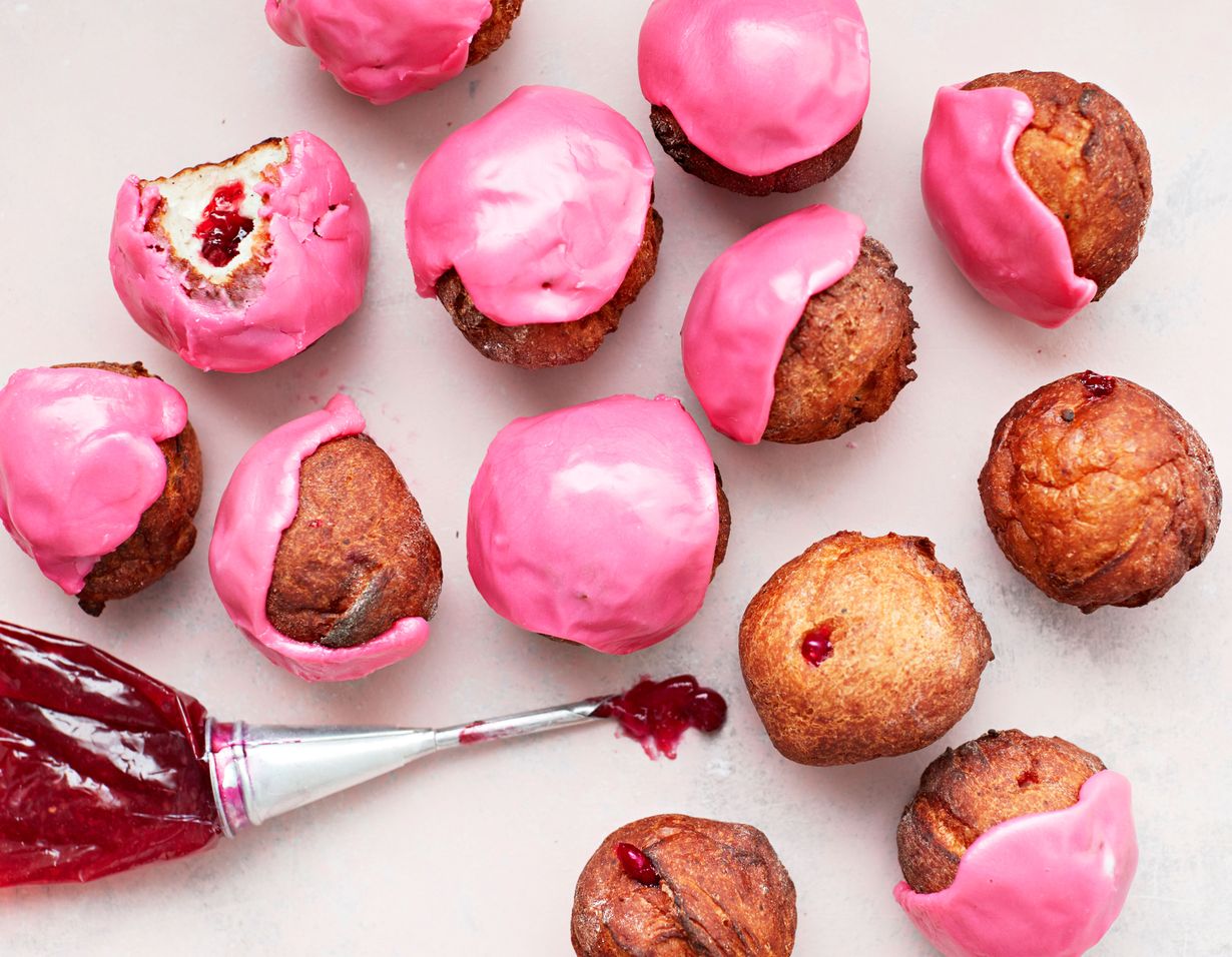 - Lusikoi vadelmamarmeladi teräväkärkisellä tyllalla varustettuun pursotinpussiin. Pursota marmeladi munkkeihin.