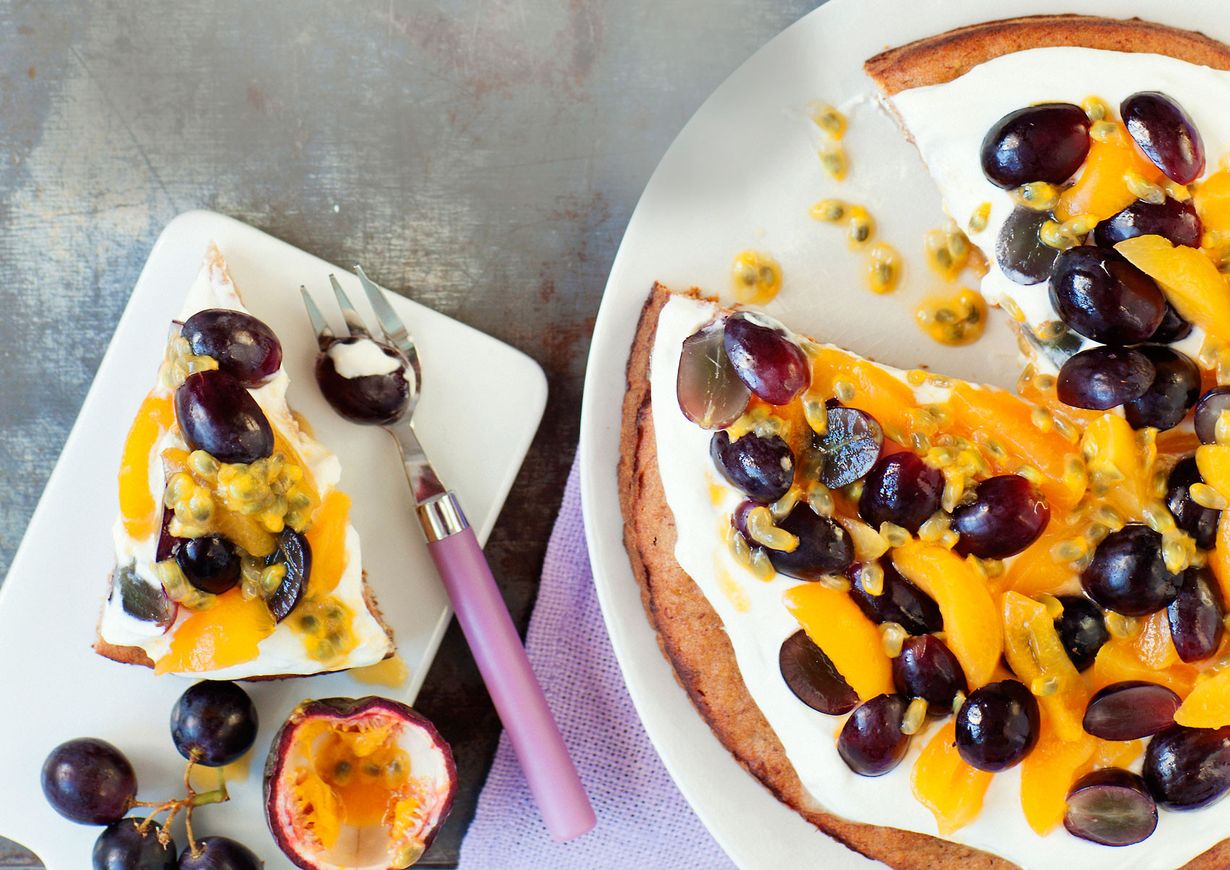 - Paloittele tuoreet hedelmät. Levitä jugurtti jäähtyneen, tarjoiluvadille nostetun kakun päälle ja koristele hedelmillä.