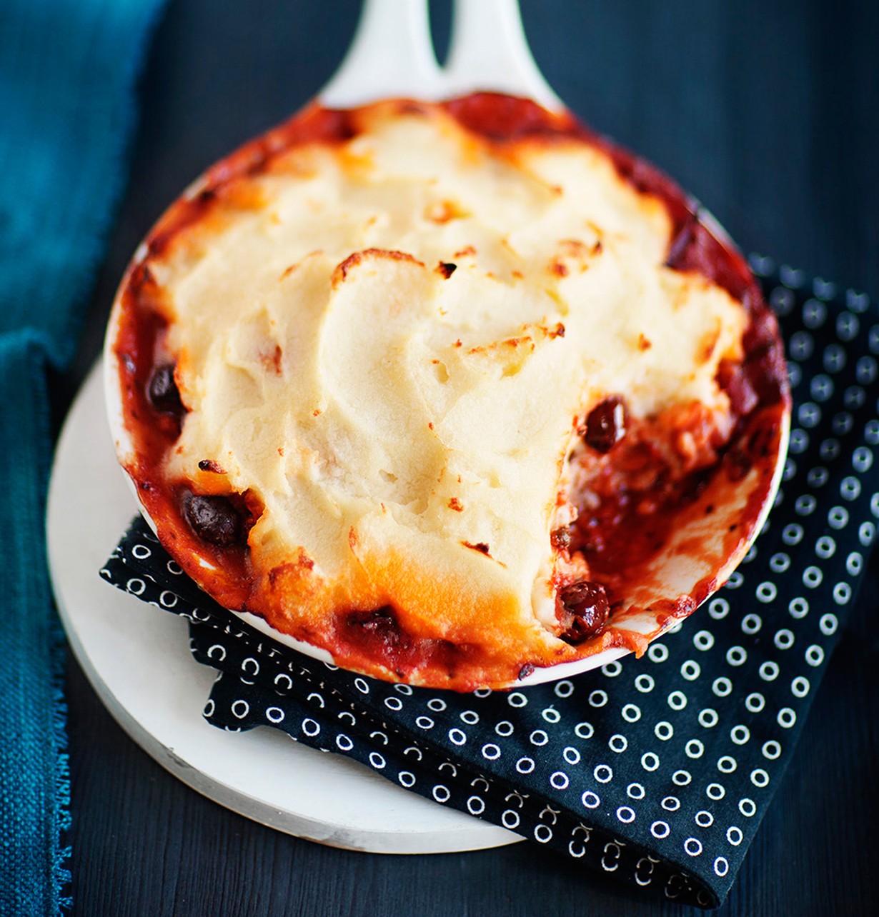 Tee kastikkeen hautuessa muusi pakkauksen ohjeen mukaan veteen, maitoon tai kasvisliemeen. Laita kastike uunivuokaan. Lusikoi päälle perunamuusi. Nosta vuoka 250-asteisen uunin ylätasolle. Anna paistua noin 5 minuuttia tai kunnes muusi saa hieman väriä. Tarjoa sellaisenaan tai vihreän salaatin kera.