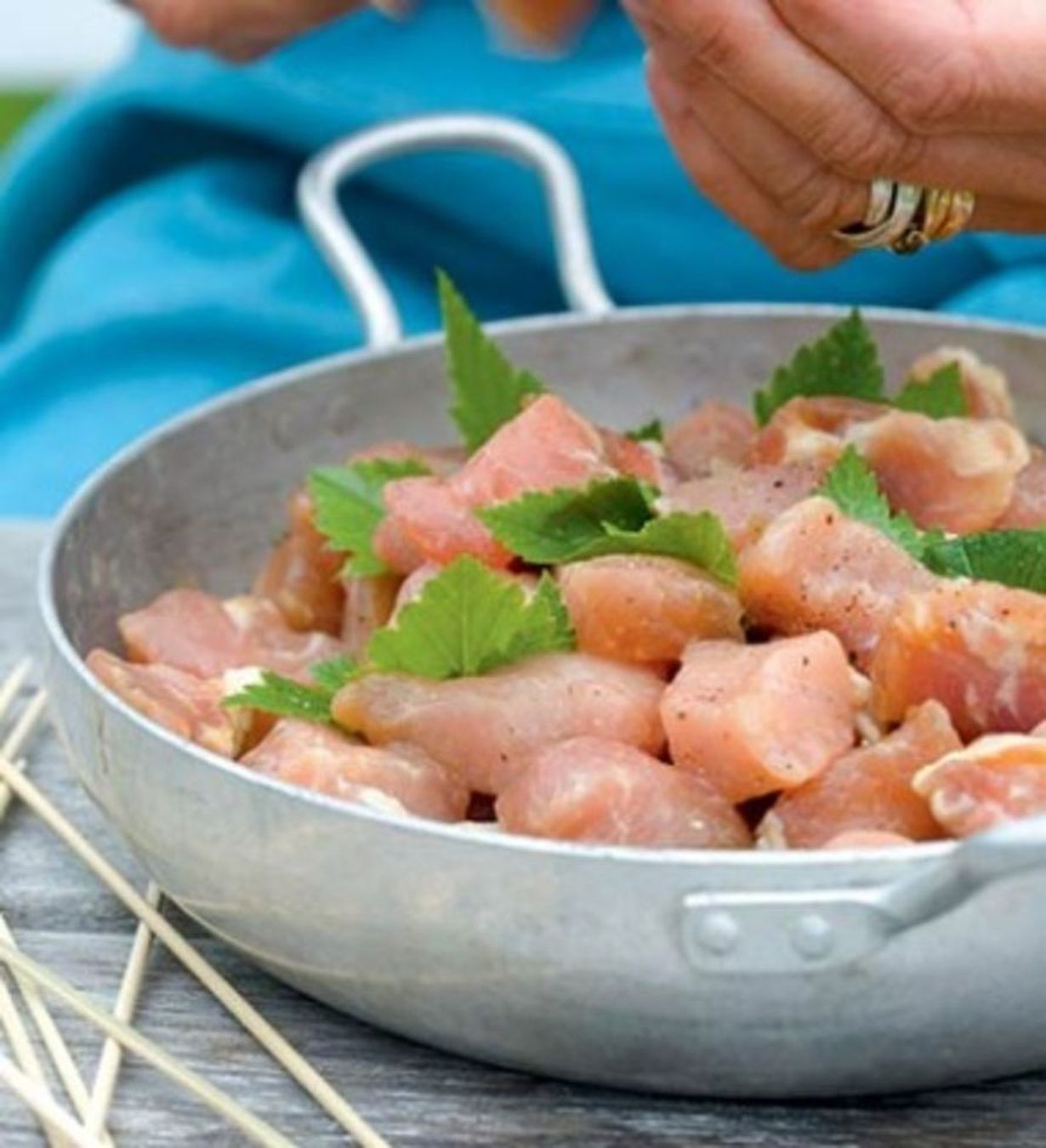 - Kuutioi liha reiluiksi paloiksi. Sekoita marinadiaineet ja kaada lihoja maustamaan.