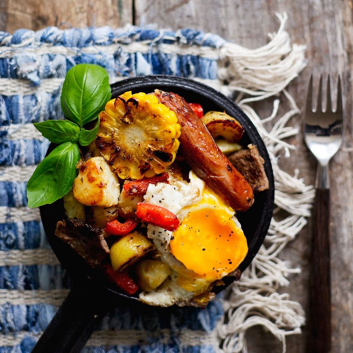 Lisää pannulle lopuksi paloitellut grilliherkut. Kuumenna nopeasti. Paista jokaisen annoksen päälle kananmuna ja tarjoa ruoka heti.