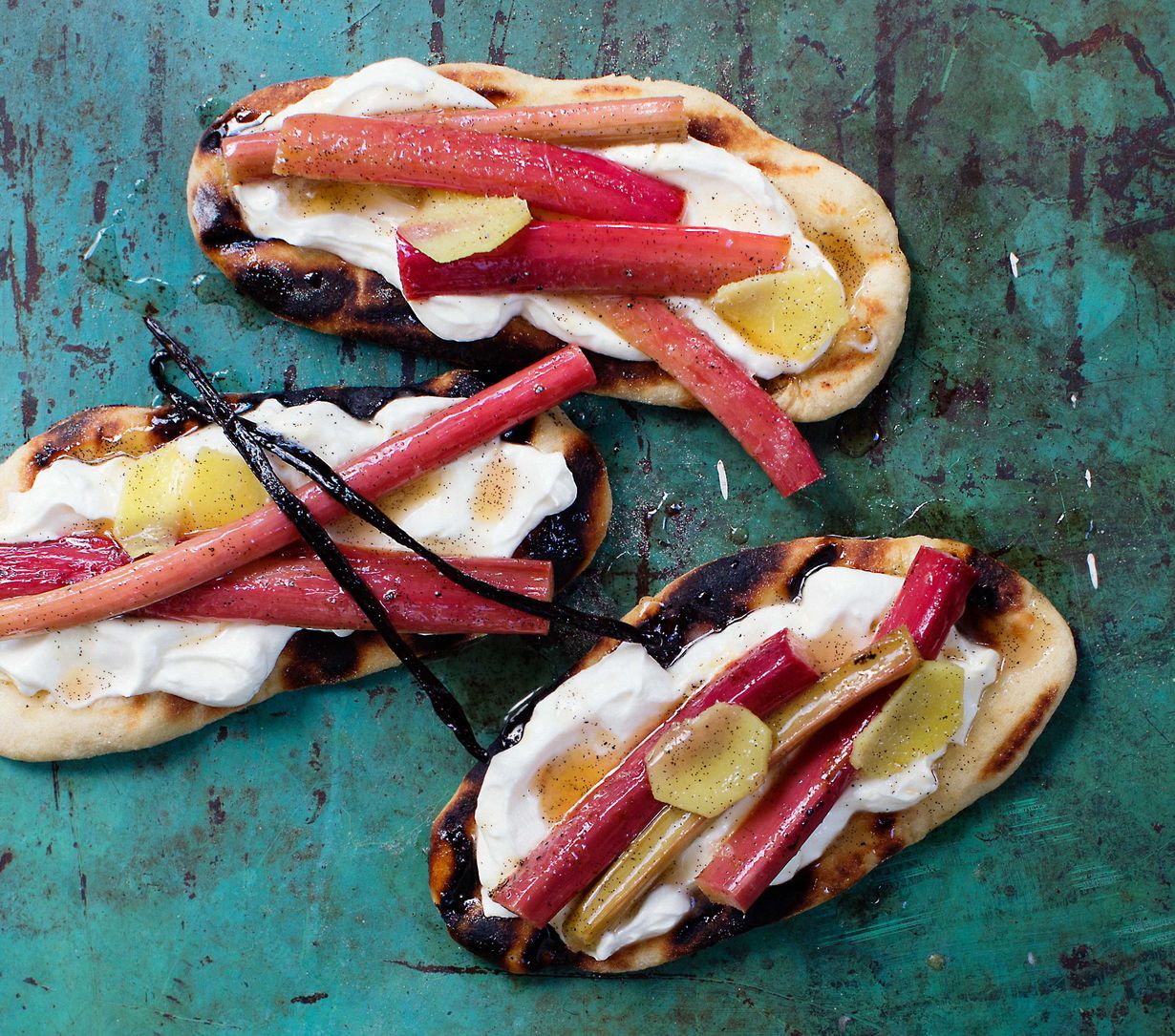 Grillaa pitsapohja rapeaksi ja täytä paistetulla raparperilla ja inkiväärillä sekä turkkilaisella jugurtilla.