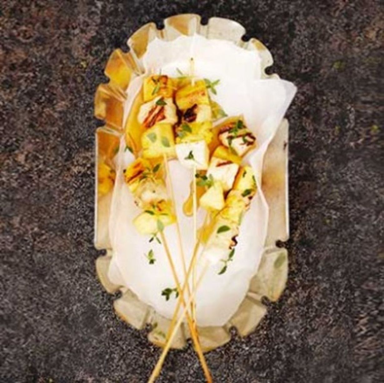 - Kuori ananas, halkaise se ja poista puumainen sisus. Leikkaa hedelmäliha reiluiksi kuutioiksi tai viipaleiksi. Viipaloi halloumi. Tikuta palat ananaksen kanssa vartaisiin.